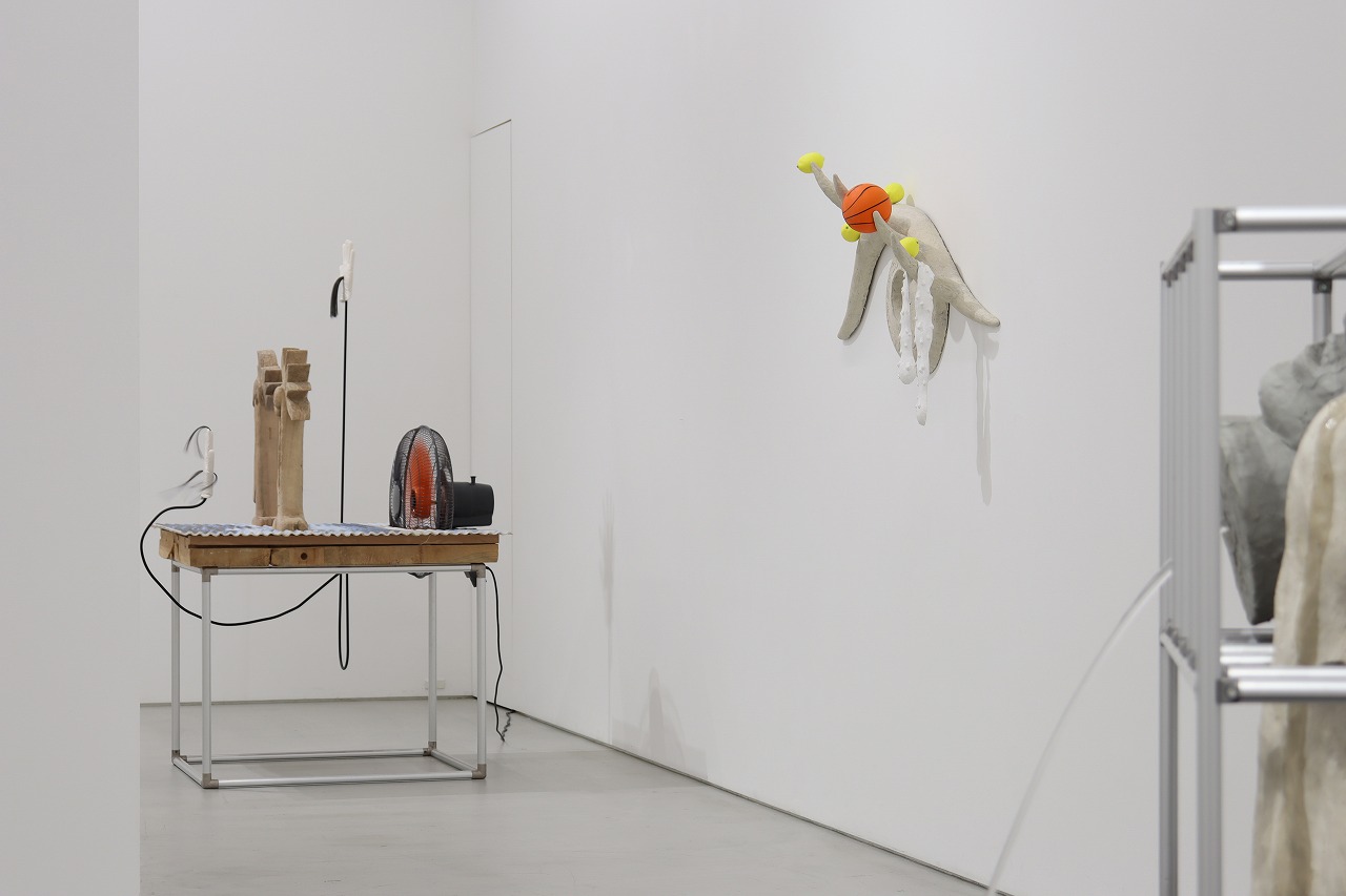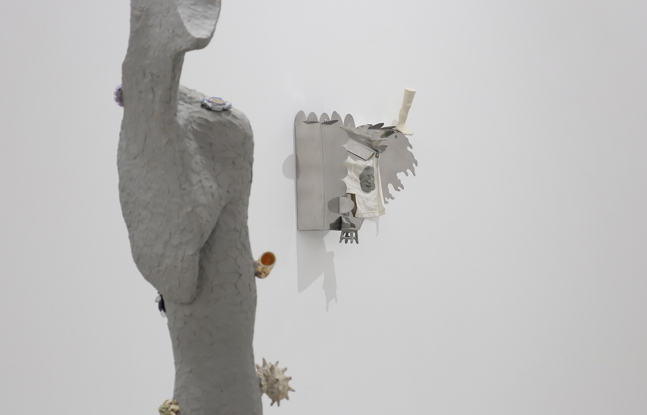 In addition, several works in this exhibition feature a character called “Mr. Sculpture” a figure with a neck that stretches and rotates. He serves roles akin to a symbol, a virus, or a signature.