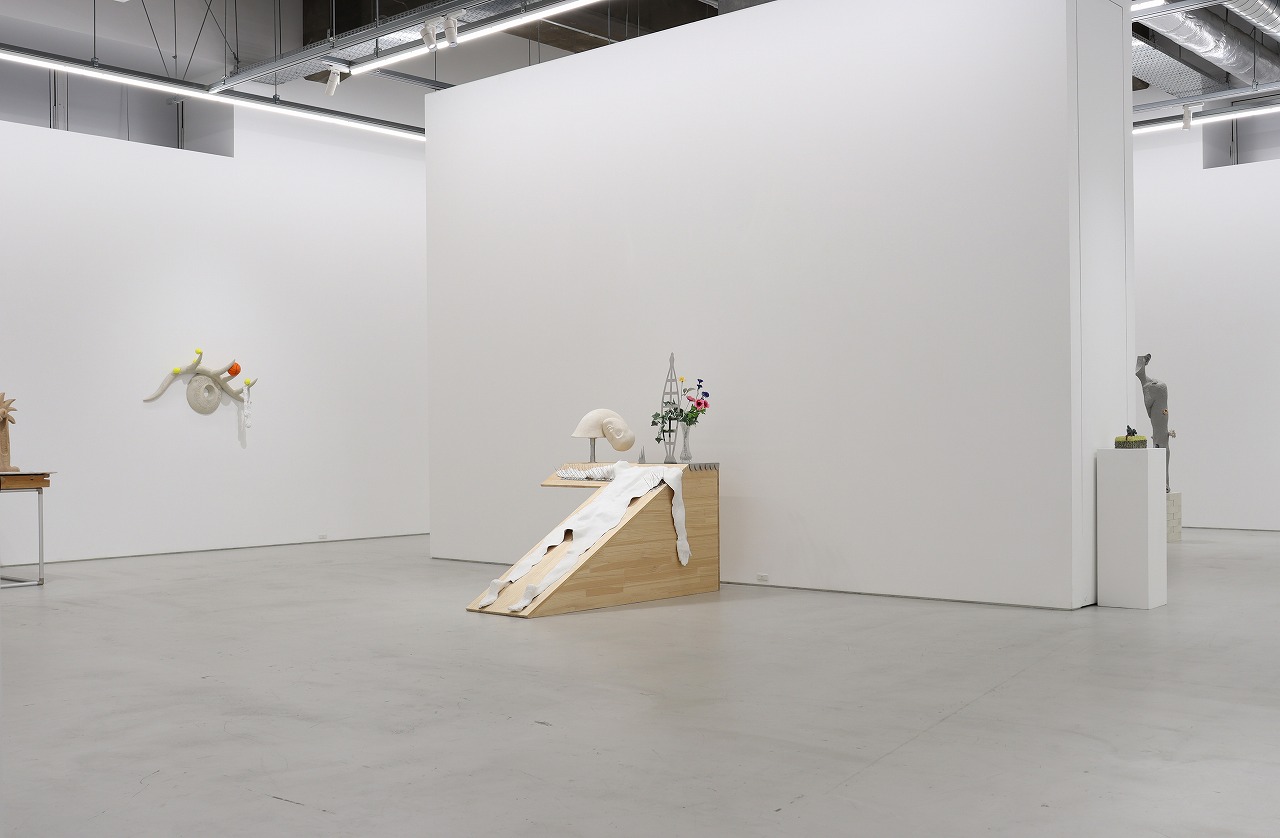 Maruyama’s sculptures are composed through a combination of objects created with diverse techniques—wood and stone carving, molds made from concrete, FRP, ceramics, plaster, and silicone rubber, as well as modeling with clay and construction putty—together with ready-made objects. Behind their light and humorous appearance lies a subtle inquiry into the very practice of sculpture, reexamining the boundaries of the concept of “sculpture” within the context of art history.